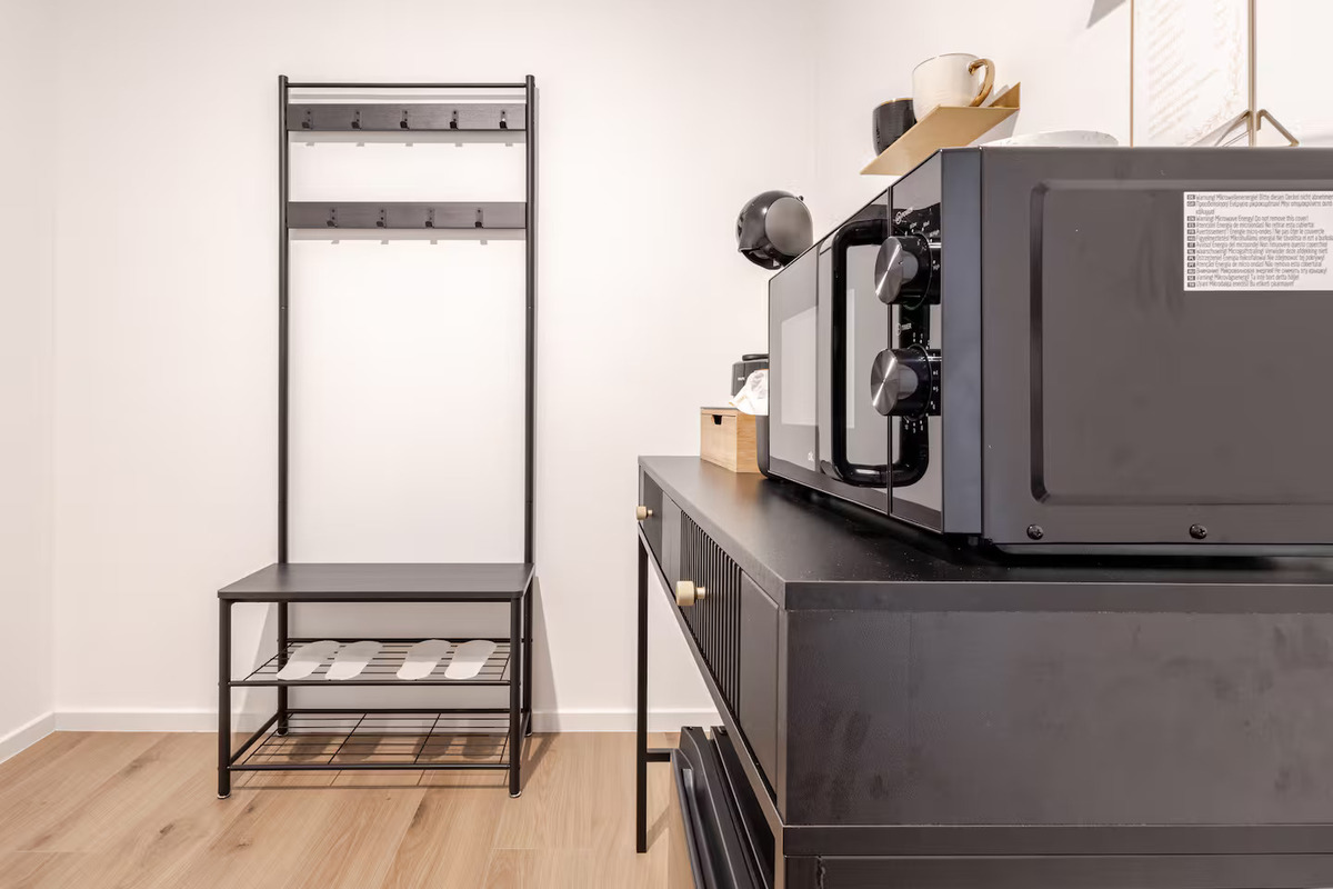 Un espace d’accueil équipé d’une machine à café, d’un micro-ondes, d’une table et de chaises pour vos petites pauses